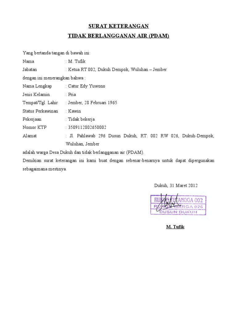 Contoh Surat Keterangan Tidak Berlangganan Pdam - Contoh Surat Keterangan Tidak Berlangganan Air Dan Telepon : Surat keterangan adalah salah satu yang penting saat melakukan magang di sebuah perusahaan.. Namun, seringkali kita bingung dalam pembuatan surat keterangan tidak berlangganan pdam. We did not find results for: Surat keterangan rt/rw tidak membayar air, jika isian biaya pdam = 0. Check spelling or type a new query. Surat keterangan adalah salah satu yang penting saat melakukan magang di sebuah perusahaan.